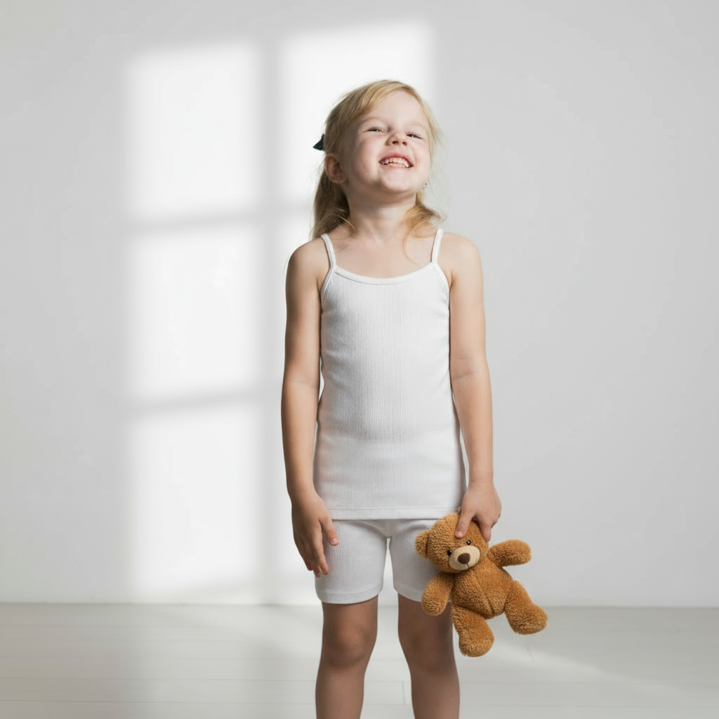 طقم داخلي بناتي قطعتين فانيلا علاق رفيع + شورت شرعي مصنوع من أجود أنواع الأقمشة القطنية الناعمة و المضادة للحساسية , صنع خصيصا لراحة طفلتكم.