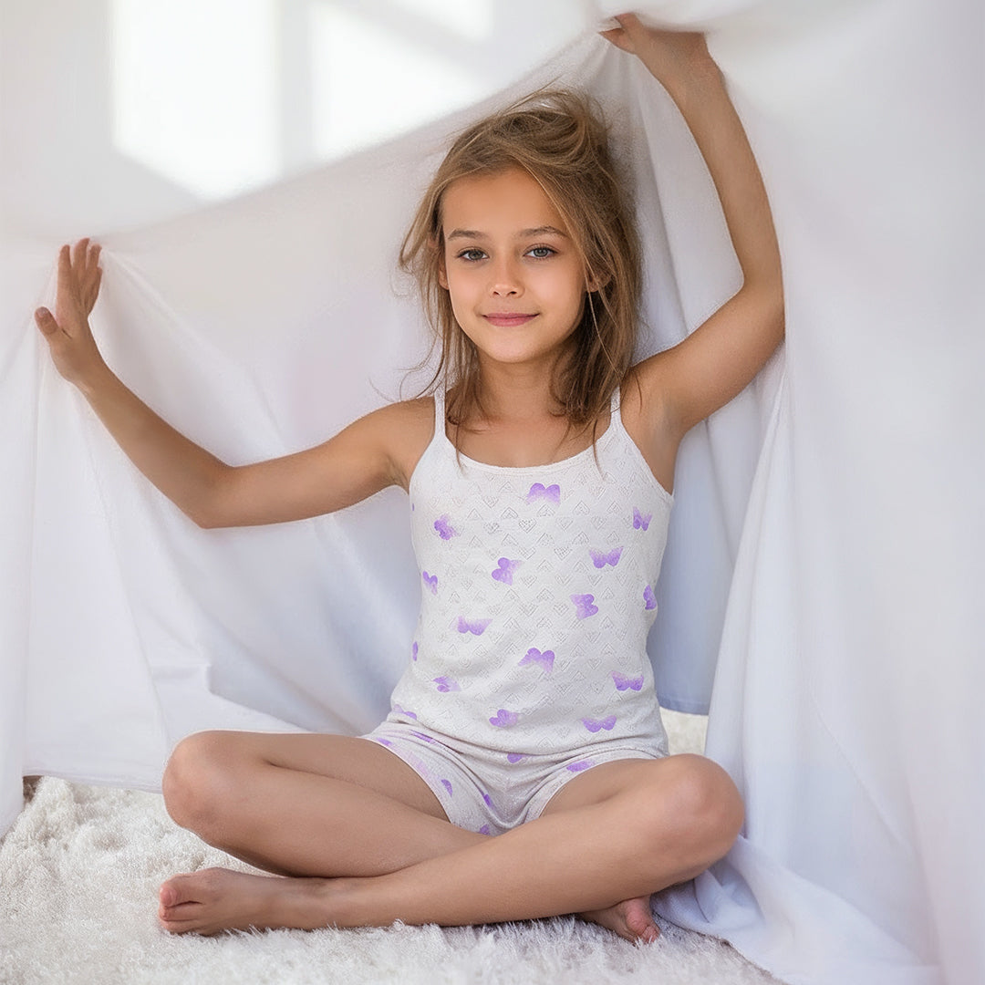 طقم داخلي بناتي قطعتين فانيلا علاق رفيع + شورت شرعي , جكار , مصنوع من أجود أنواع الأقمشة القطنية الناعمة و المضادة للحساسية , صنع خصيصا لراحة طفلتكم.